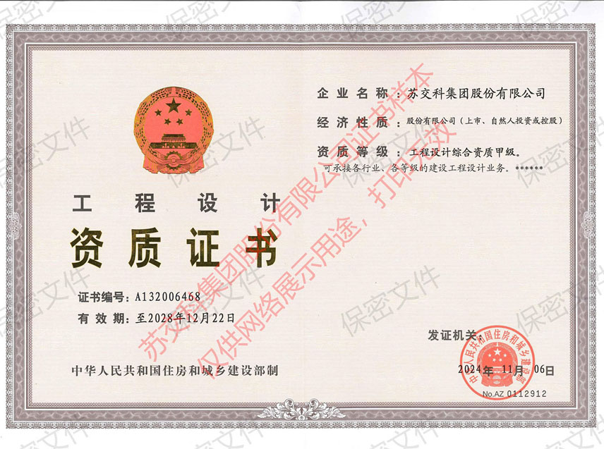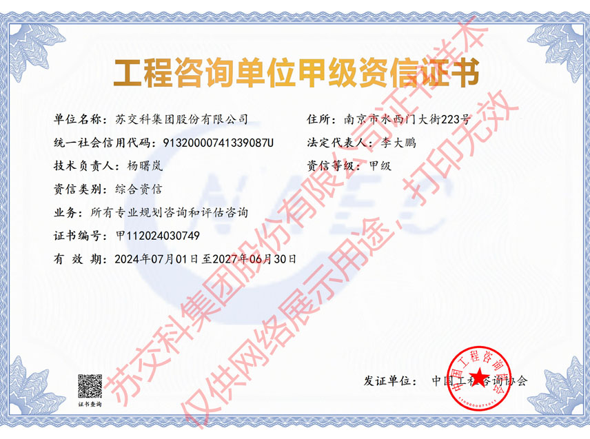蘇交科擁有工程行業(yè)各領(lǐng)域甲級(jí)資質(zhì),包括城鄉(xiāng)規(guī)劃甲級(jí)資質(zhì);工程咨詢(xún)綜合甲級(jí)資質(zhì);工程咨詢(xún)專(zhuān)業(yè)甲級(jí)資質(zhì)(公路、生態(tài)建設(shè)和環(huán)境工程、水文地質(zhì)、工程測(cè)量、巖土工程、城市規(guī)劃、鐵路、城市軌道交通、港口河海工程、市政公用工程(市政交通、給排水)、水利工程、旅游工程);工程設(shè)計(jì)綜合甲級(jí)資質(zhì);工程勘察綜合類(lèi)甲級(jí)資質(zhì);測(cè)繪甲級(jí)資質(zhì);公路工程和市政公用工程總承包一級(jí)資質(zhì);公路工程、水運(yùn)工程、市政公用工程監(jiān)理甲級(jí)資質(zhì);公路工程甲級(jí)、公路工程交通工程專(zhuān)項(xiàng)、水運(yùn)工程材料甲級(jí)和水運(yùn)工程結(jié)構(gòu)甲級(jí)試驗(yàn)檢測(cè)資質(zhì)。