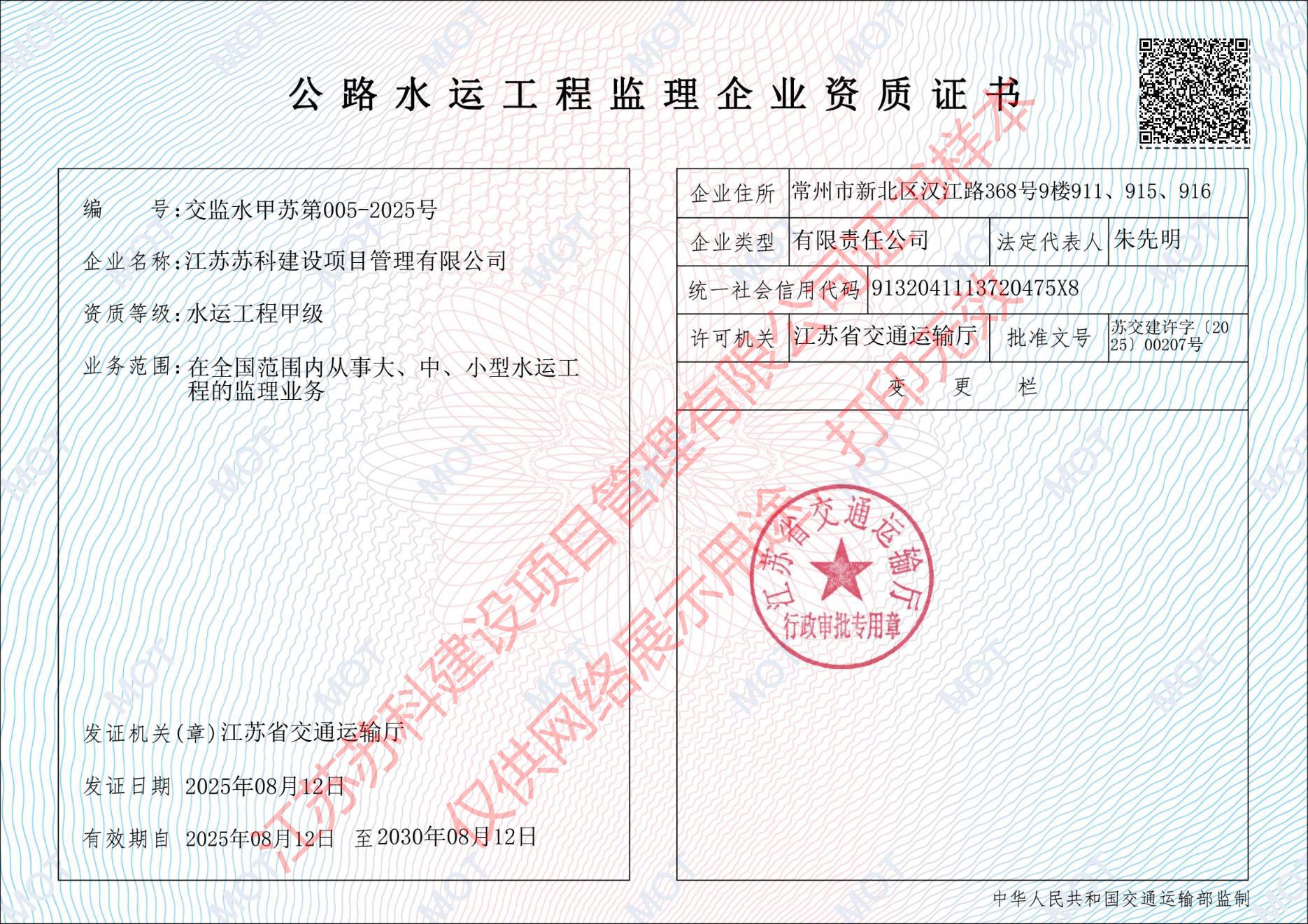 蘇科建設(shè)工程監(jiān)理水運(yùn)工程資質(zhì)甲級(jí)