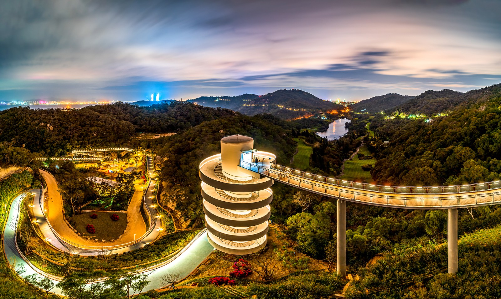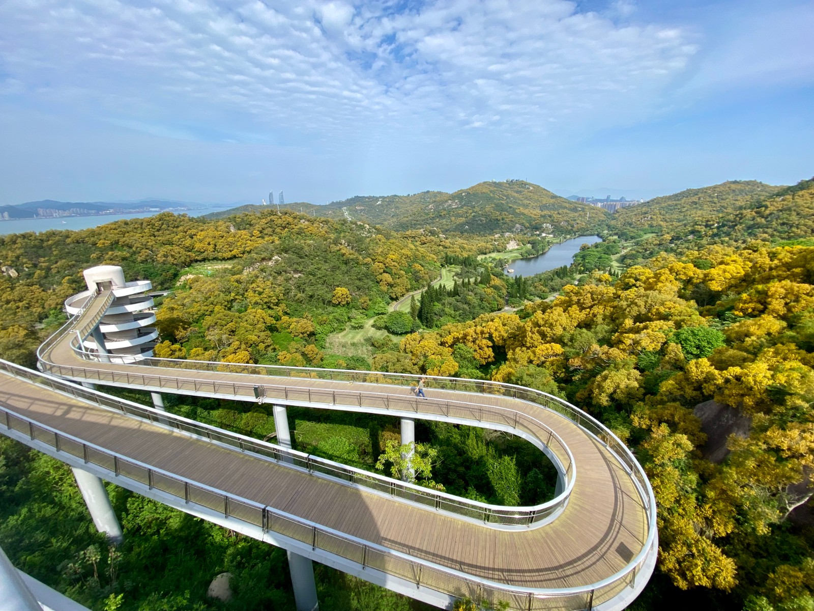 項(xiàng)目秉持 “生態(tài)優(yōu)先、以人為本” 理念,打造 “梅海花臺(tái)”、“萬(wàn)石蒼?!?、“盼歸塔” 等地標(biāo)節(jié)點(diǎn),讓游人盡享 “穿林海、登高峰、賞湖景、瞰海天”之愜意。保護(hù)山林生態(tài)環(huán)境,采用鏤空橋面鋪裝保護(hù)原生喬木,再生水回用于消防、灌溉及路面沖洗,對(duì)山林環(huán)境實(shí)現(xiàn)低影響、輕介入。主線(xiàn)全程無(wú)障礙通行,設(shè)置34處出入口及多處無(wú)障礙設(shè)施,便捷串聯(lián)沿線(xiàn)景區(qū)、景點(diǎn)及民宿群落,豐富旅游業(yè)態(tài)。項(xiàng)目運(yùn)用BIM技術(shù)優(yōu)化異形結(jié)構(gòu)設(shè)計(jì),同步構(gòu)建橋梁健康監(jiān)測(cè)與智慧管理系統(tǒng),實(shí)現(xiàn)低碳運(yùn)維與安全管控一體化。
