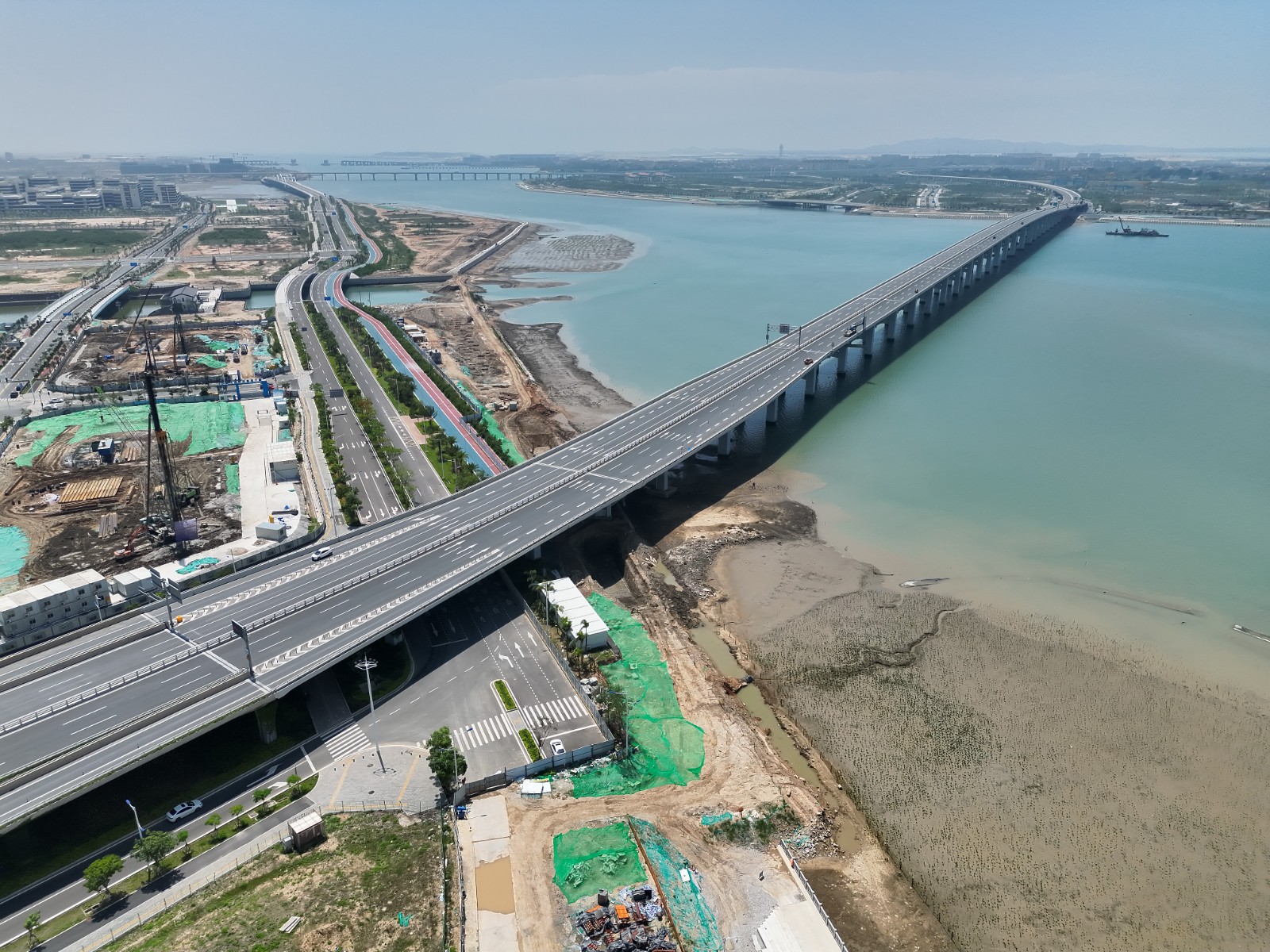 溪東路(翔安南路-機(jī)場(chǎng)快速路段)全長(zhǎng)6公里,由陸地高架橋、跨海大橋與3座互通立交群組成,構(gòu)建了多層次交通體系,高架層主路以快速路標(biāo)準(zhǔn)實(shí)現(xiàn)高效通行,地面輔路銜接城市主干網(wǎng);1.3公里雙層跨海大橋驚艷亮相—上層機(jī)動(dòng)車(chē)道流暢通達(dá),下層專(zhuān)屬慢行系統(tǒng)串聯(lián)兩岸,獨(dú)特橋梁造型獲得外觀(guān)專(zhuān)利,打通大嶝島慢行交通脈絡(luò)。三大互通立交群暗藏巧思:茂林、東園互通以全互通設(shè)計(jì)實(shí)現(xiàn)快速路無(wú)縫轉(zhuǎn)換,蟳窟 Y 型立交精準(zhǔn)銜接機(jī)場(chǎng)動(dòng)線(xiàn),通過(guò)交通模型分析與主輔系統(tǒng)分離設(shè)計(jì),在復(fù)雜城區(qū)環(huán)境中破解了車(chē)流交織難題。創(chuàng)新應(yīng)用無(wú)砂真空預(yù)壓工藝,攻克深厚淤泥地基處理難題。